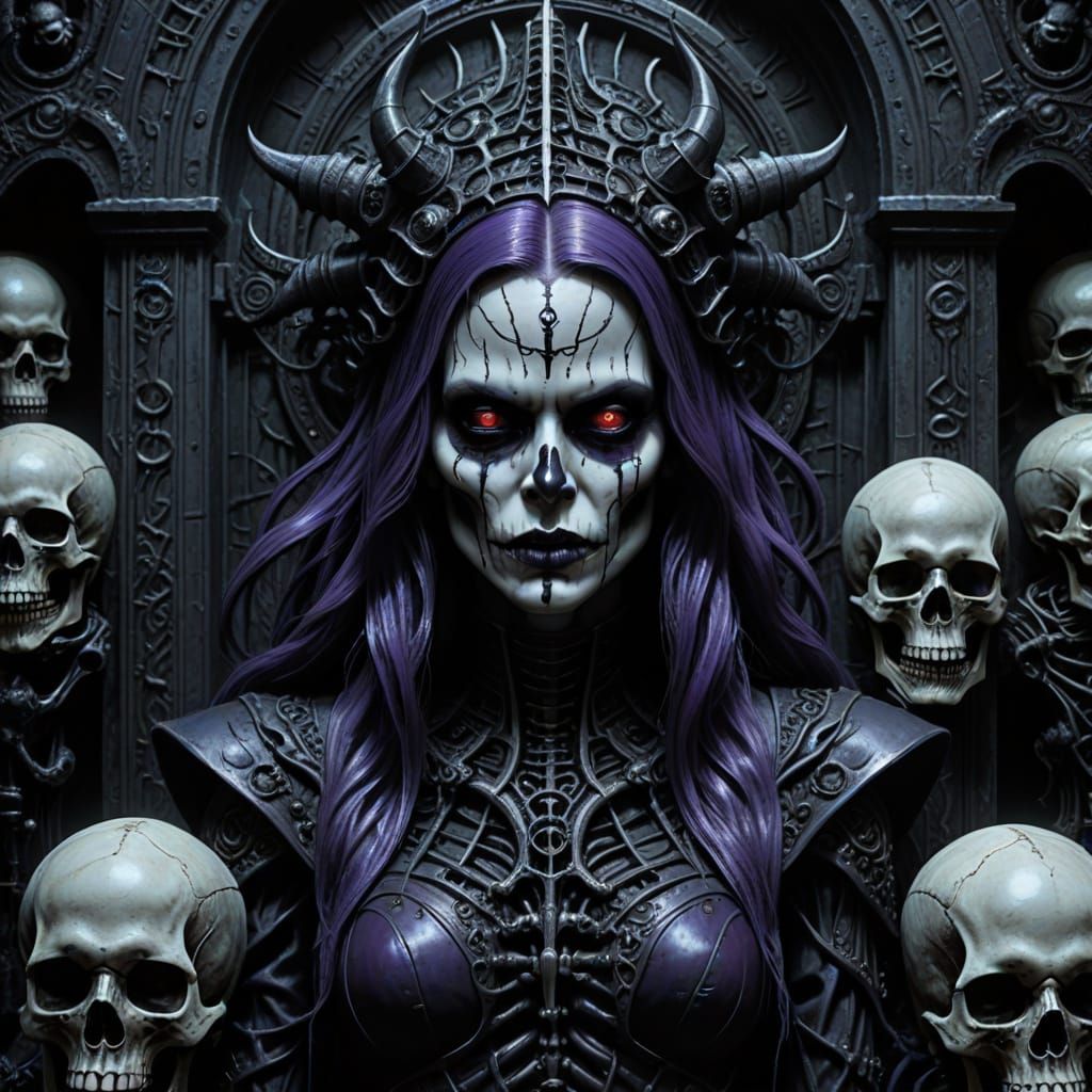 This image shows a medium shot of a bloody Lilith standing on skulls. She has violet eyes and purple ombre hair, and is dressed in dark purple in a psychedelic horror aesthetic. The image has dark, muted colors with bursts of deep purple and red.