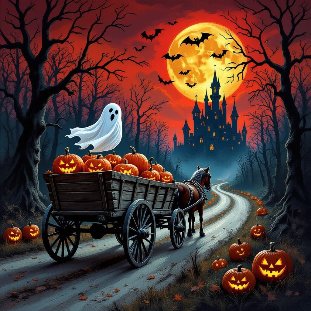 A horse-drawn cart decorated for Halloween, filled with pumpkins and featuring a ghost and bats, travels a dark forest road toward a castle under a red moon, in a style reminiscent of fantasy illustration.