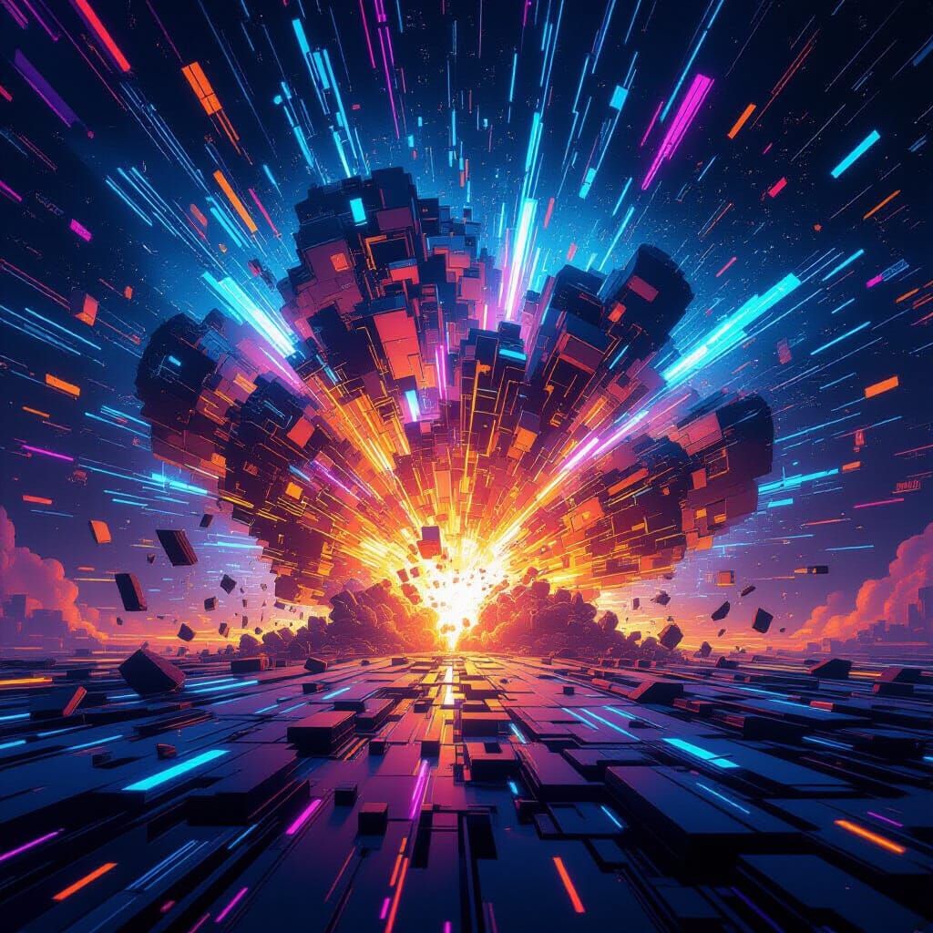 A dramatic digital painting depicting a massive explosion of swirling circuits, holographic data, and neon energy. Features vibrant blues, purples, and oranges, evoking cosmic scale and technological power.