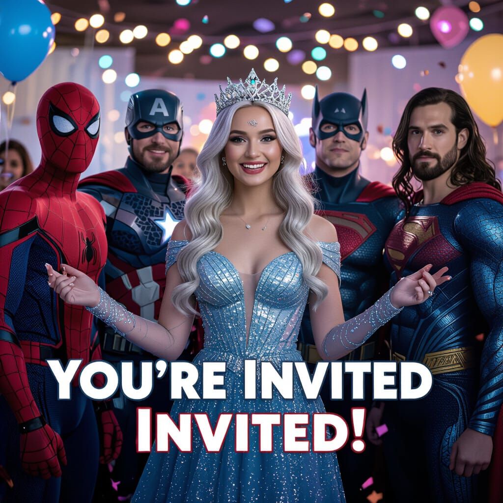 This image shows Marvel and DC superheroes gathered for a celebration. They surround a woman in a blue gown, against a backdrop of party lights, balloons, and confetti. The vibrant photo evokes a joyful, heroic atmosphere.