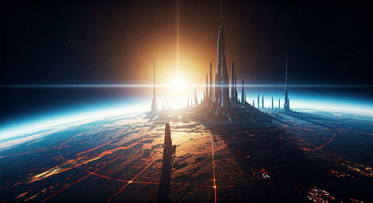 A hyperrealistic digital painting showcasing a vast alien city covering a planet, with towering spires and glowing networks, illuminated by a star. The scene emphasizes epic scale and luminous colors.