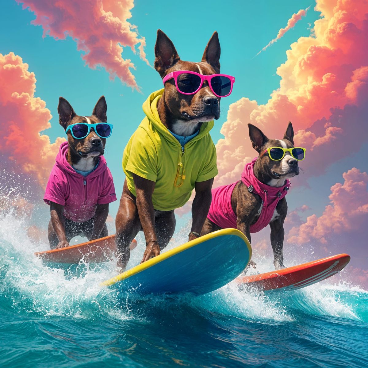 A vibrant image showcasing Staffordshire Bull Terriers surfing massive rainbow waves. The dogs wear neon sunglasses, and psychedelic colors create a bizarre, dreamlike, surf-inspired scene with fractal textures.