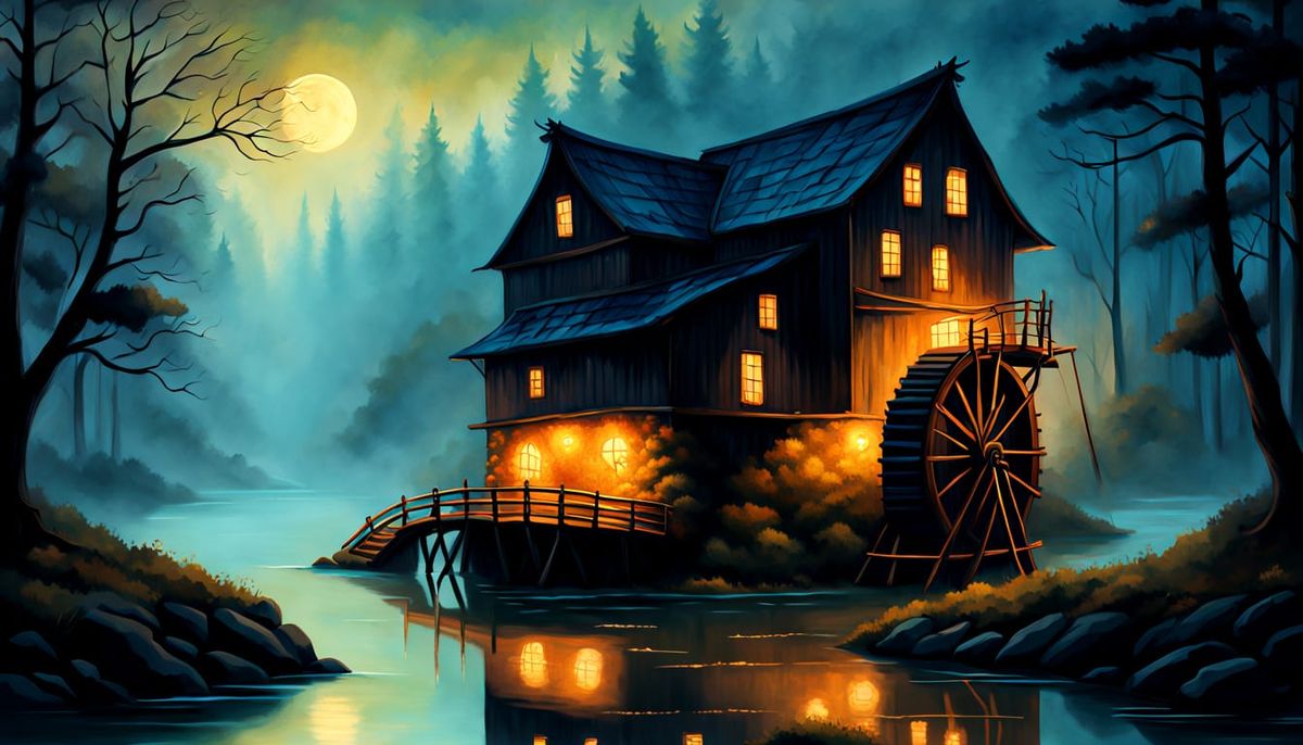 This enchanting oil painting depicts a historic waterwheel standing alone on the banks of a glowing bioluminescent river. Soft ethereal light emanates from the wooden slats, casting an intricate dance of light and shadow on the dark water. A vibrant yet muted night sky with countless stars twinkles above...