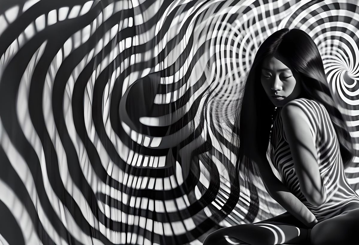 Psychedelic concept photography. A pretty Asian feminine slender curving delicacy blending into illusory black and white wavy line shadows spiraling concentric circles with extreme long flowing hair merging and blending with wavy shadows contrasting and emerging from black and white background. In 8K ...