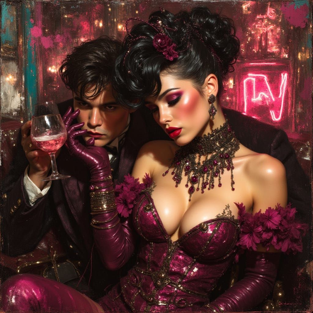 This image depicts the Moulin Rouge in a detailed, dramatic impasto oil painting style, featuring a palette knife technique and soft, diffuse lighting.