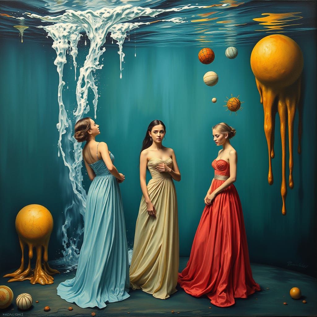 A surreal image of girls in elegant gowns under a waterfall. The artwork features melting objects and an oil on canvas texture, reminiscent of dreamlike surrealism.