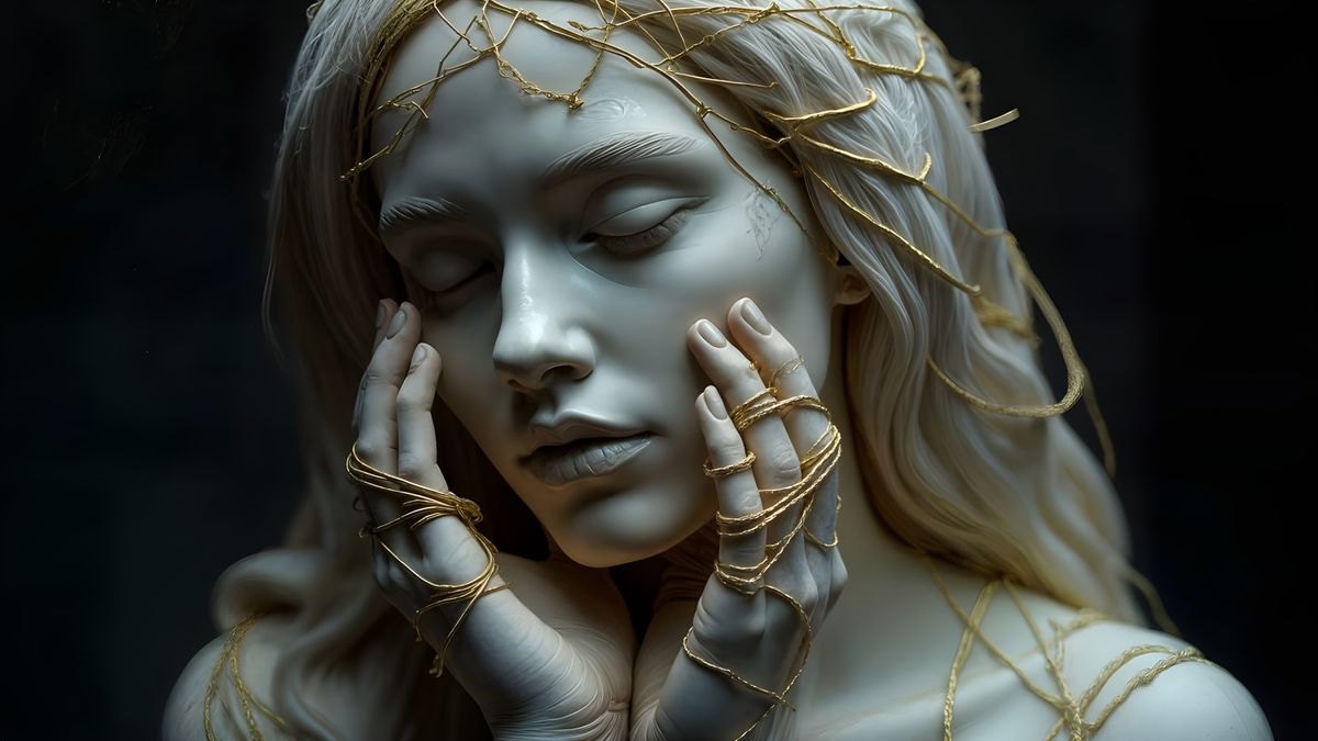 This image shows a detailed marble sculpture of a woman partially formed from golden yarn. The artwork has a surreal and hyperrealistic aesthetic, with a moody, cinematic feel.
