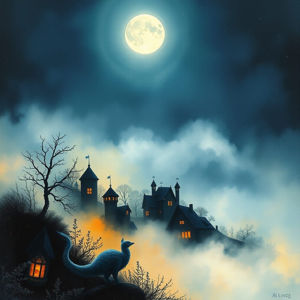 A striking picture of a foggy, mystical realm bathed in moonlight. It features watercolor, ink, and acrylic textures in a double exposure style, rendered with cinematic lighting and intricate storybook details.