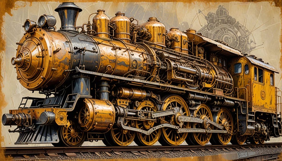 This image depicts a hyperdetailed train engine with a vibrant yellow and copper color scheme, a silver cowcatcher, and rich patina, created using a combination of oil painting and digital glitch effects, set against a dramatic chiaroscuro background.