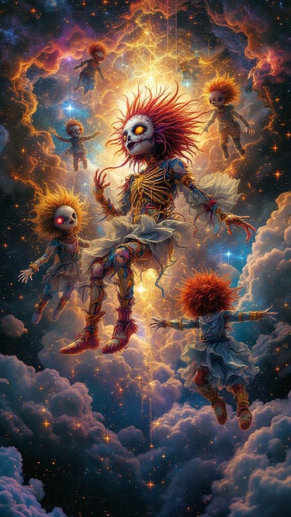 A vibrant image of voodoo dolls floating in an astral plane. The dolls are surrounded by cosmic clouds and stardust in this digital artwork with a psychedelic aesthetic.