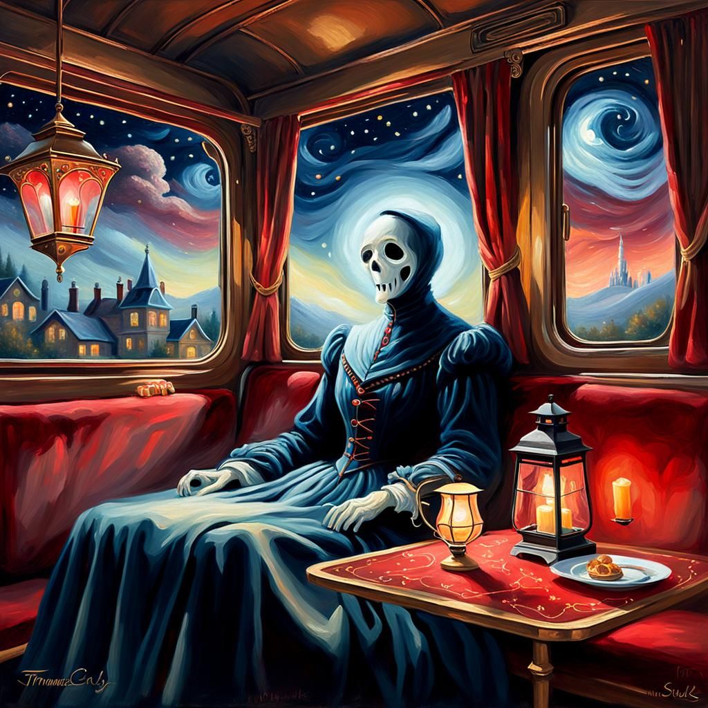 A painterly image of a ghostly figure on a train. Soft lantern light illuminates a red dining cart under a starry sky. The artwork evokes warm, cozy feelings with vibrant colors and soft brushstrokes.