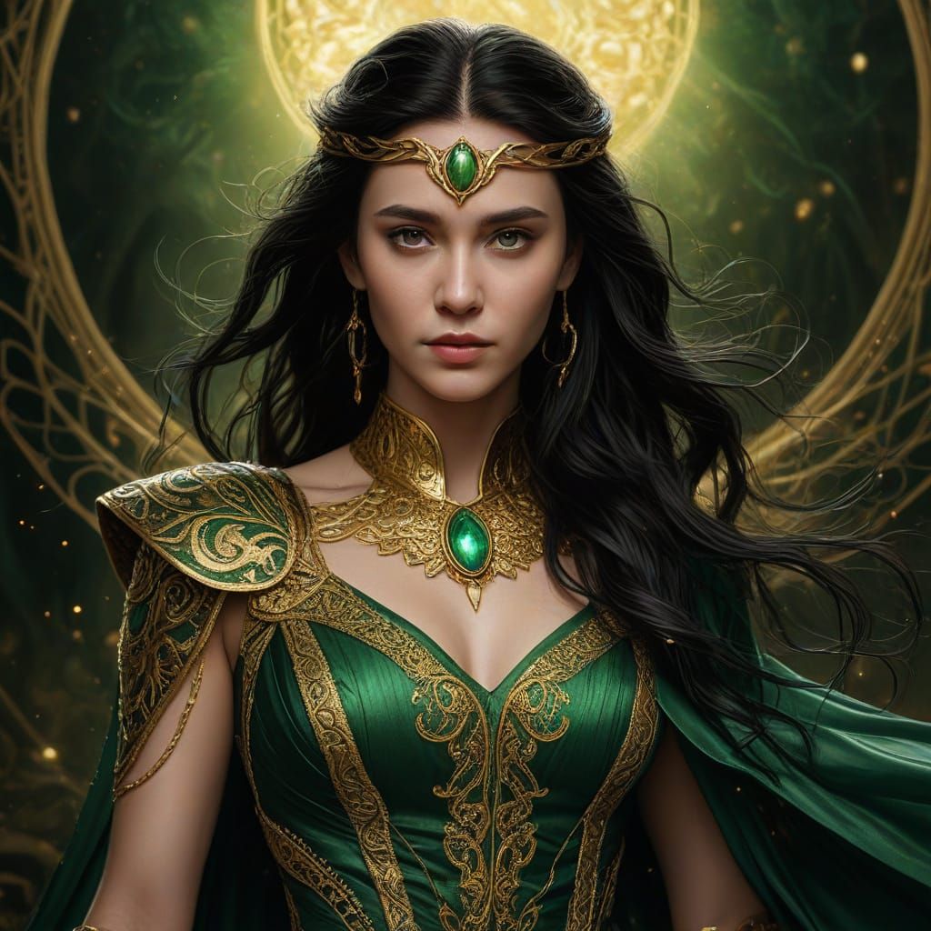 This image shows Loki's daughter in a green and gold dress. The digital painting features intricate golden embroidery, long flowing black hair, and soft, warm lighting, creating an enchanting and elegant fantasy illustration.