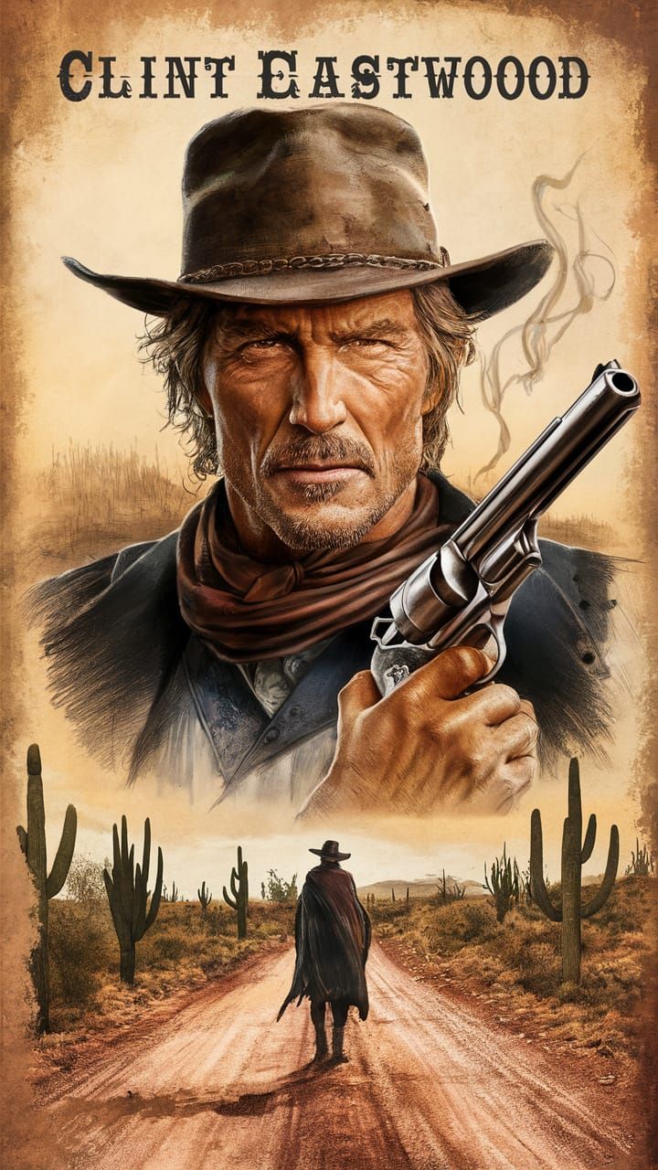 A color sketch of a weathered cowboy in a wanted poster. He wears a cowboy hat, holds a revolver, and stands in a desolate Wild West landscape, creating a rugged and mysterious atmosphere.