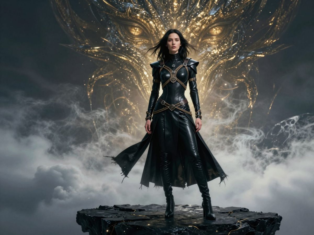 This image depicts a woman with calm focus on a floating stone plateau above cosmic clouds, alongside an enigmatic, colossal creature, in a blend of myth and futuristic design.