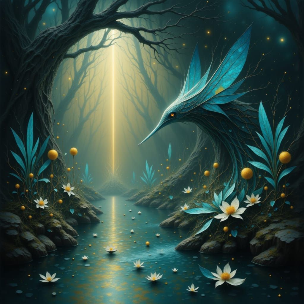 A hyper-detailed, photorealistic image of the Swan of Tuonela swimming peacefully under a weeping willow. Features volumetric lighting and a cold, contrasting color palette.