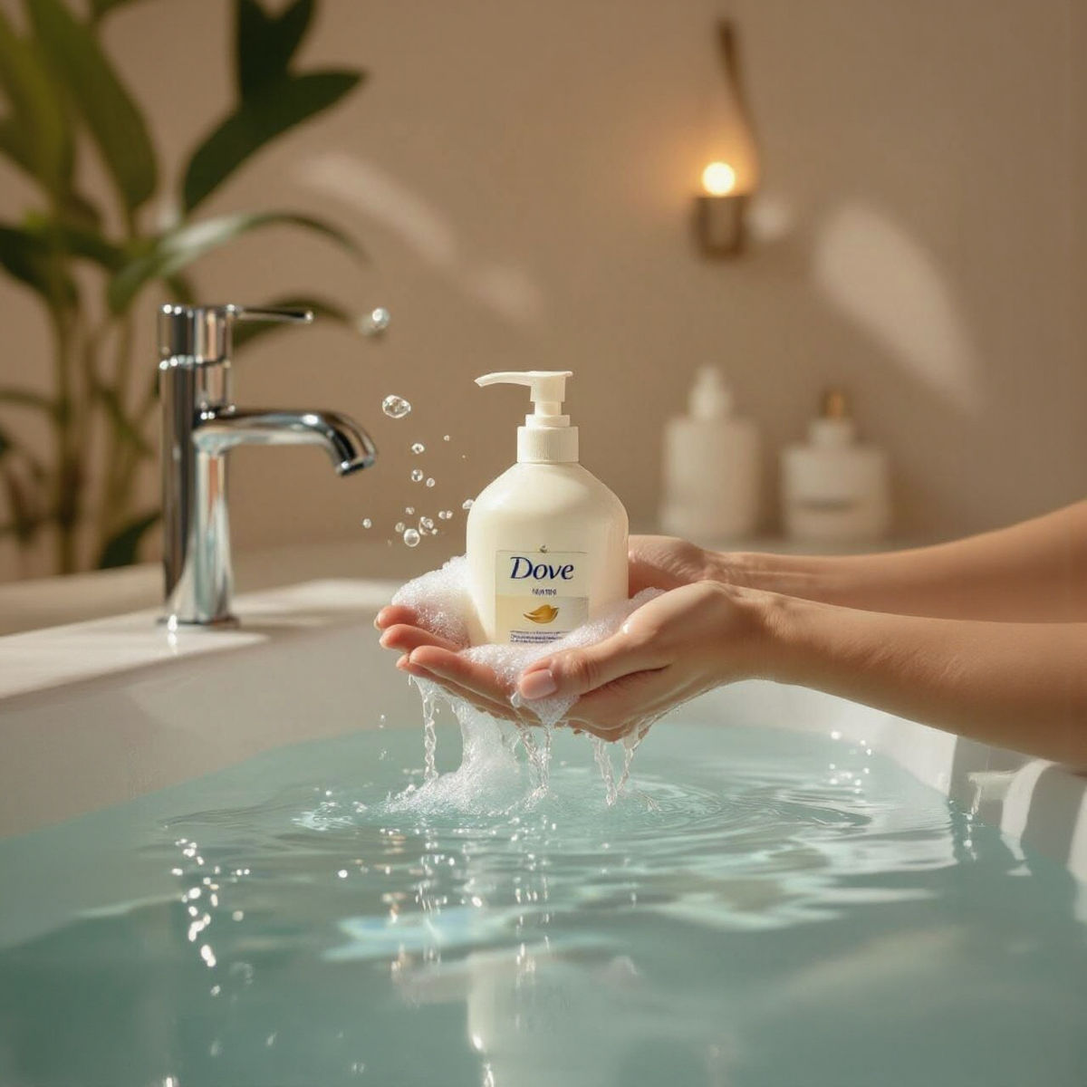 This image shows a close-up of a soft hand washing with Dove soap. Water flows gently, emphasized by soft, diffused lighting and a focus on the creamy lather in a clean, minimalist style.