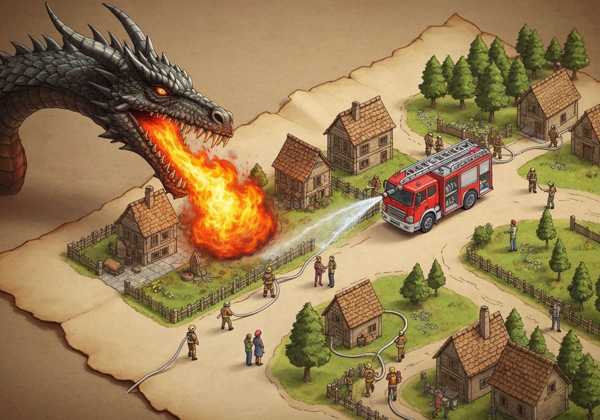This image shows a dragon breathing fire onto a miniature village map. Tiny firefighters combat the blaze while people evacuate and a safety zone is established in this whimsical 3D scene.