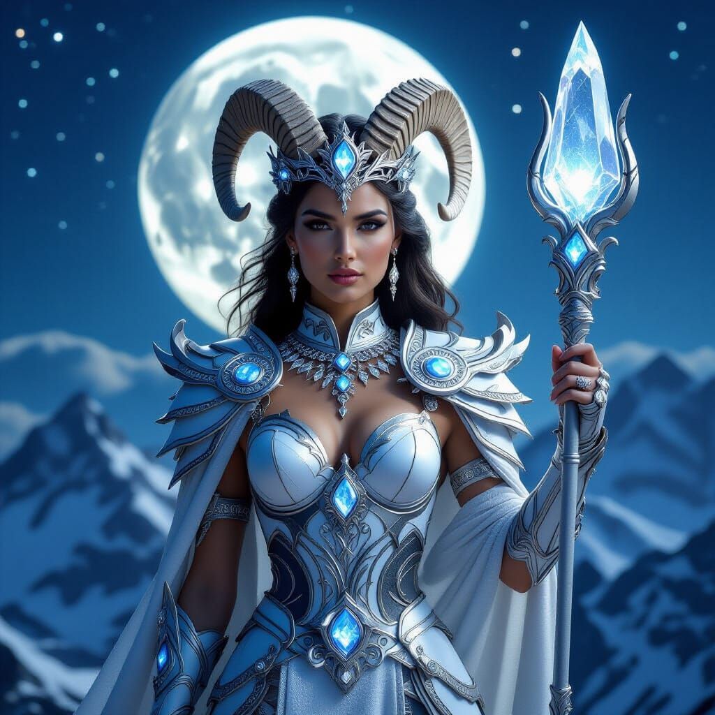 A powerful, determined Capricorn woman in ornate armor stands on a mountain peak beneath a full moon and starry sky. This photorealistic fantasy portrait captures authority and celestial connection.