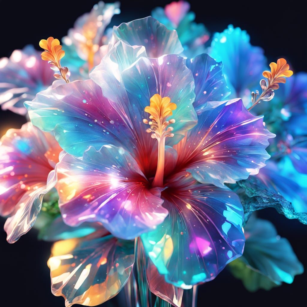 This hyperrealistic digital art showcases a detailed bouquet of aqua green, translucent crystal hibiscus flowers. Cinematic lighting highlights their vibrant colors and ethereal glow.