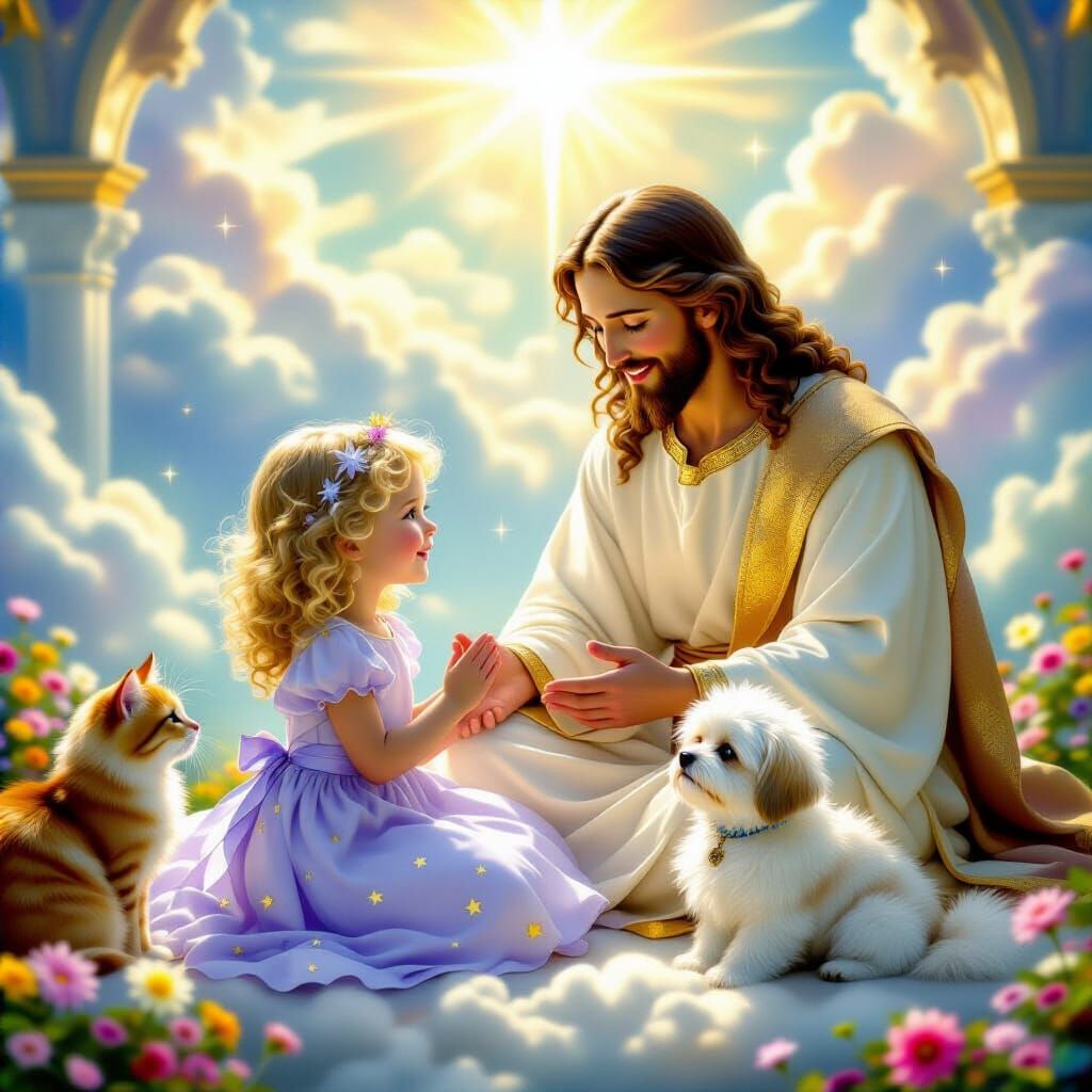 This image shows a joyful girl playing at Jesus' feet in a radiant heavenly palace, accompanied by pets. Rendered with divine light and ethereal atmosphere.