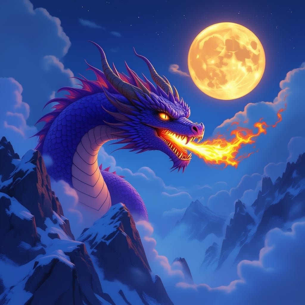 This image shows a majestic purple dragon with glowing blue eyes, breathing fire as it flies near a large orange moon. Snow-capped rocks and clouds surround the dragon in a dramatic scene.