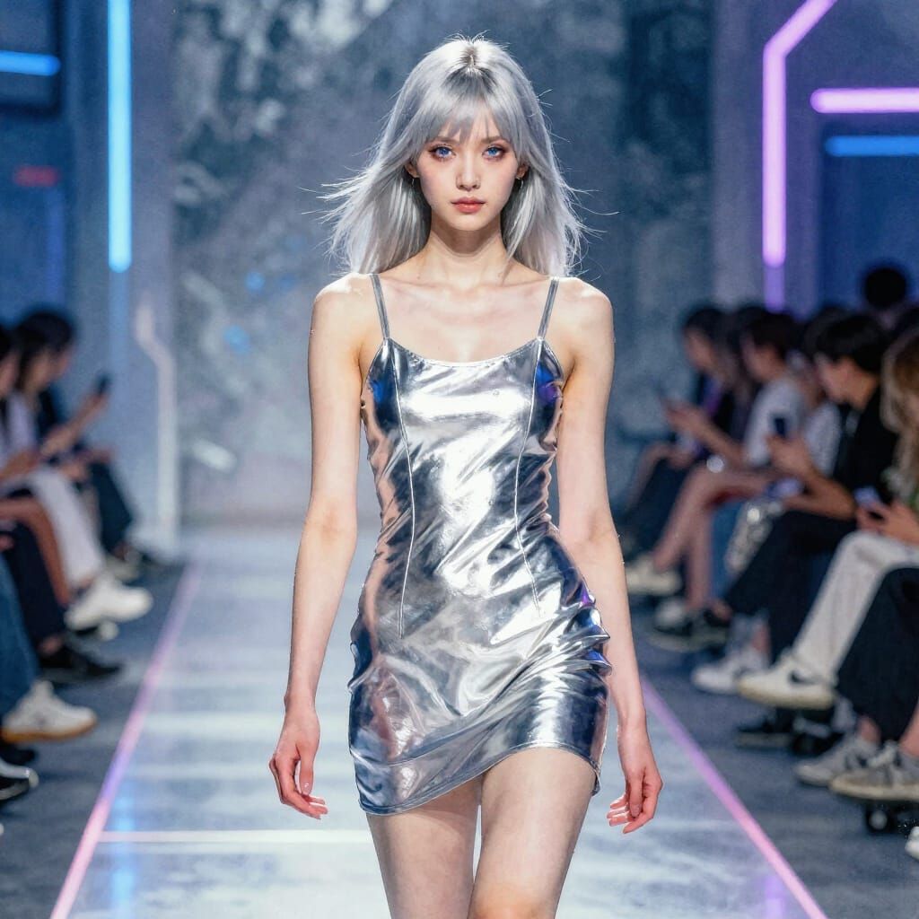 This image shows a silver-haired woman in a metallic dress walking on a futuristic runway, depicted in a watercolor art style with neon accents.