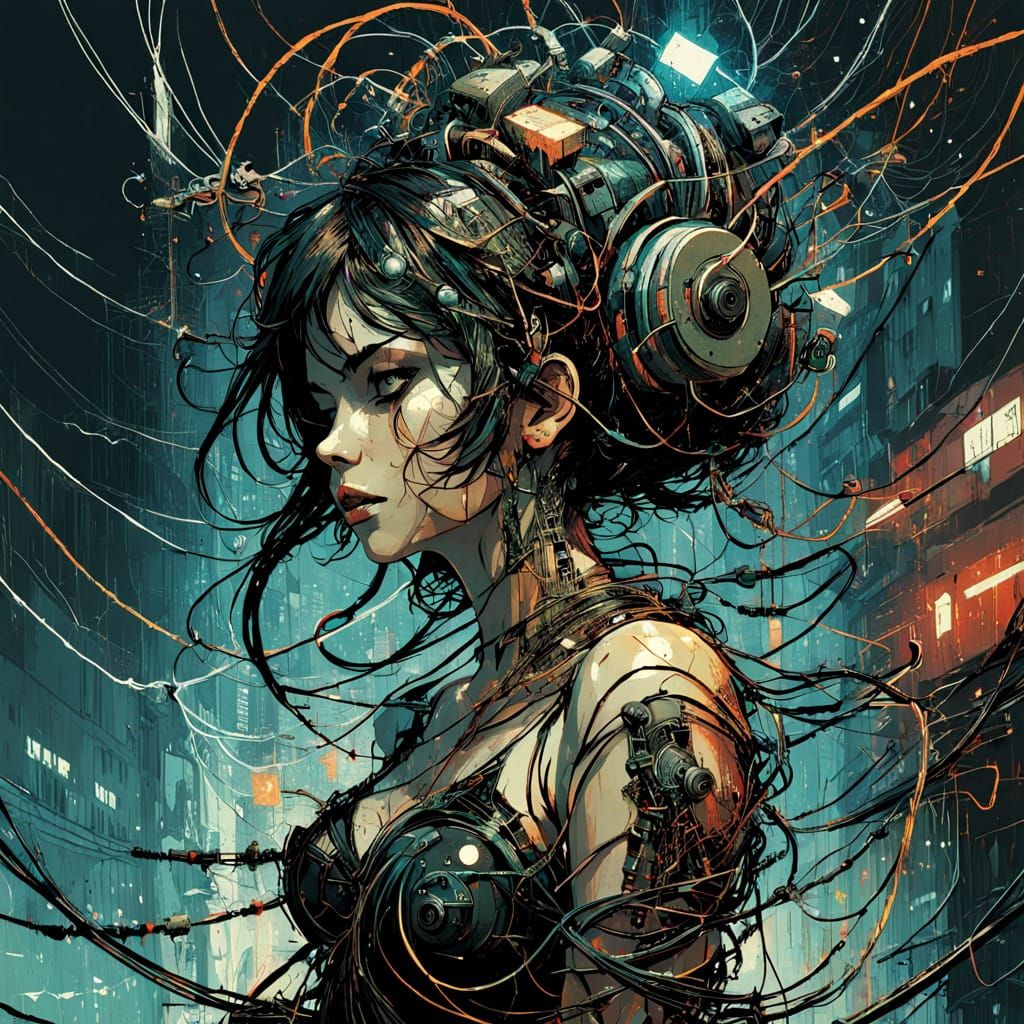 This image depicts a futuristic wire sculpture in a state of chaotic disorder, with wires entwined in a mesmerizing pattern, evoking a sense of magical cyberpunk art.