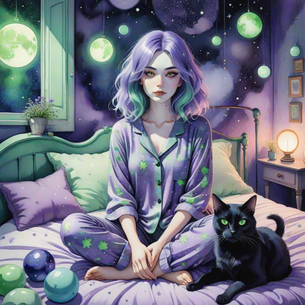 whimsical illustration of a young woman with flowing lavender and indigo hair, wearing celestial print pajamas, sitting cross-legged on a bed. A fluffy black cat with luminous green eyes rests beside her. The background features a cosmic themed room with soft, glowing orbs. Watercolor effect, high detail, ...