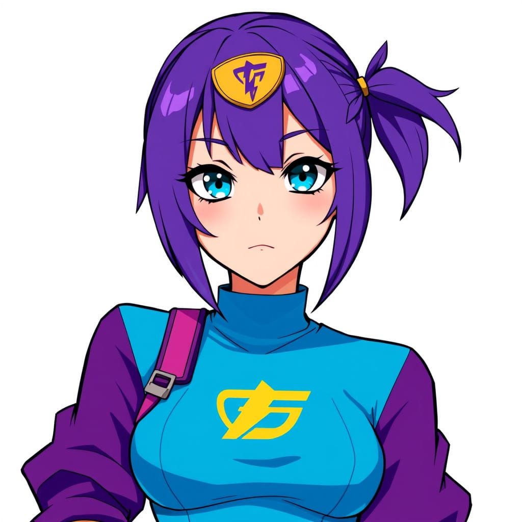 This digital anime art piece features a woman with striking cerulean eyes, edgy hairstyle, and a fitted dress with a bold logo, all inspired by the vibrant styles of manga artists like Hirohiko Araki and Range Murata, with a modern anime flair