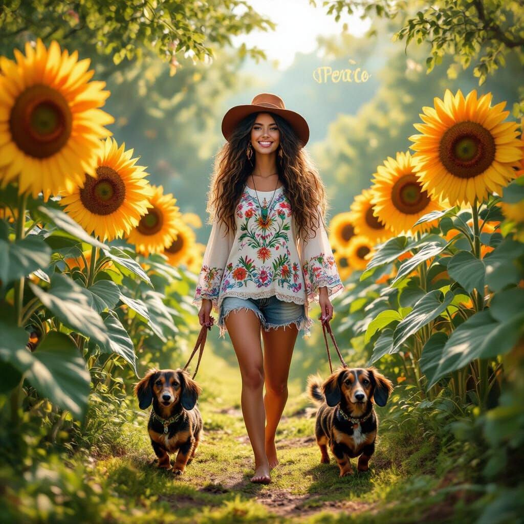 This image shows a barefoot hippie woman walking with dachshunds in a vibrant sunflower garden. Sunlight streams through the trees, creating a dreamy, nostalgic scene with botanical details.