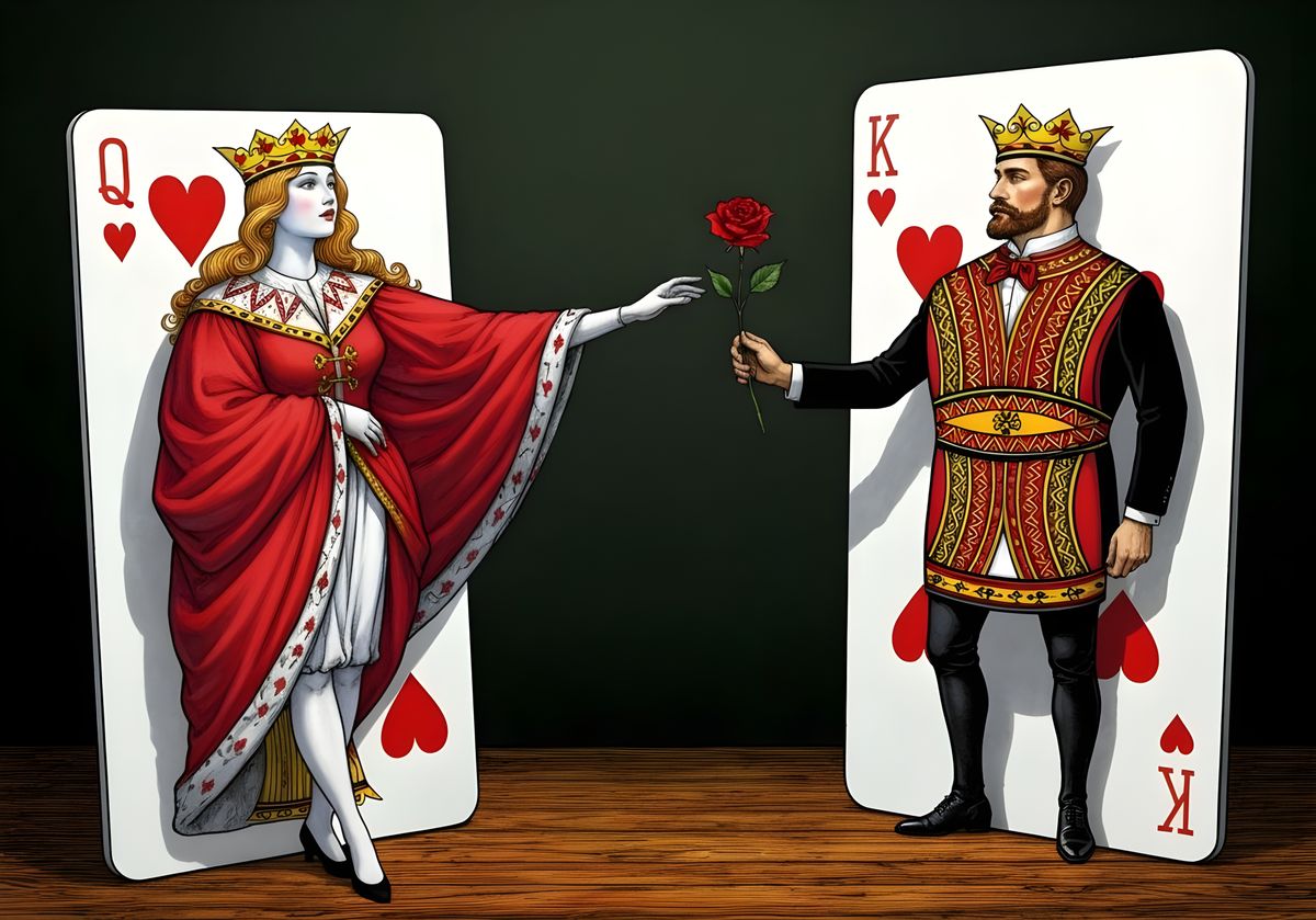 This image depicts the Queen and King of Hearts emerging from their cards, sharing a tender moment with a rose. The scene is rendered with extreme realism and high definition for a lifelike appearance.