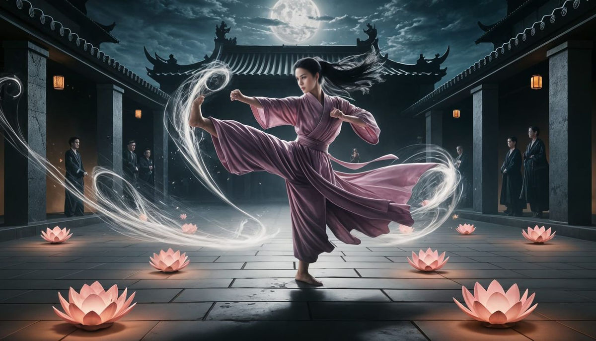 A captivating image of a martial artist executing a karate kick in a serene courtyard. The scene blends elements of Chinese drama with glowing lanterns and temple silhouettes, creating a mystical atmosphere.