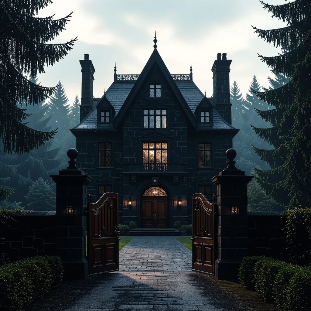 This hyperrealistic image showcases a grand gothic mansion of black stone and wood, featuring antique mahogany double doors, set against a vast, dark green forest. Dramatic lighting enhances its mysterious gothic ambiance.