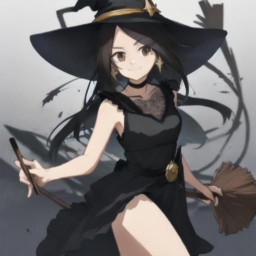 This image shows a cute anime-style witch with black hair and big brown eyes, wearing a witch hat and a short black dress, and holding a straw broom. It is a digital anime illustration.