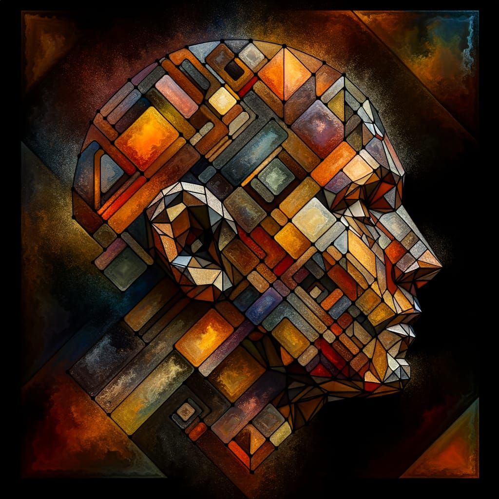 This image presents a fragmented geometric human head in warm colors, with surfaces resembling aged, corroded metal and deep black shadows for dramatic effect.