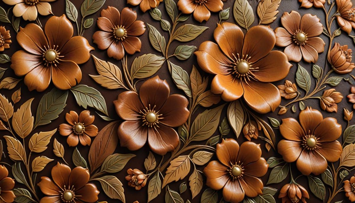 A striking image of intricately stitched brown leatherwork adorned with delicate floral patterns. The macro photograph showcases a close-up view with soft, golden lighting and warm earthy tones, rendered as an oil painting.