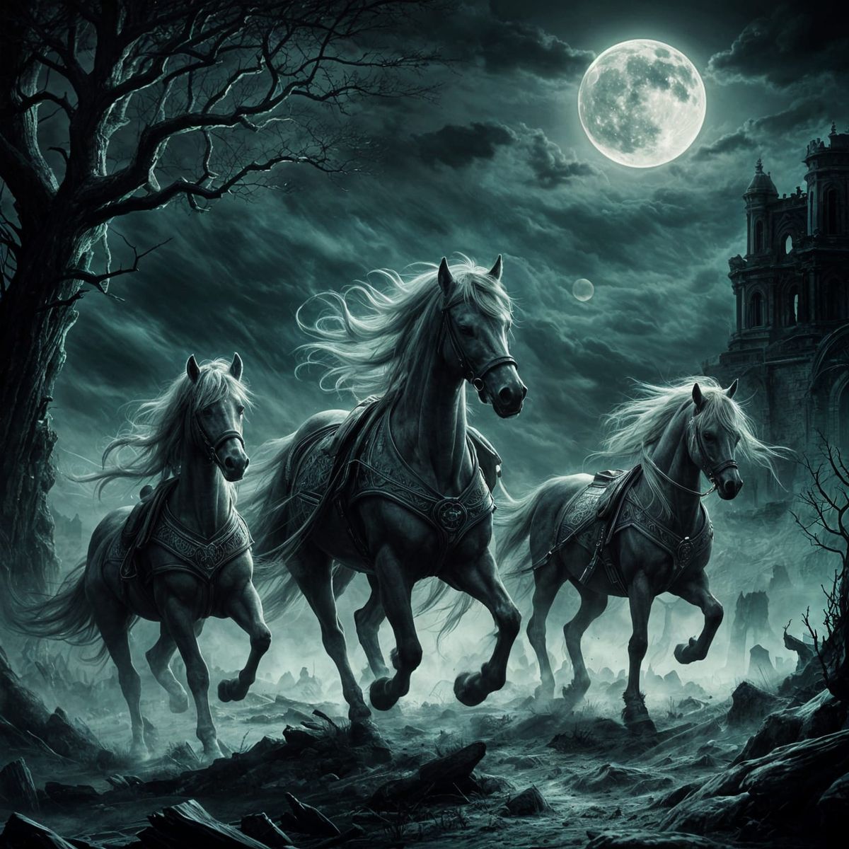 This image depicts ghostly riders on glowing spectral horses, clad in tattered armor, moving through a foggy, moonlit plain. A dark forest and ruins loom in the background, creating an eerie, atmospheric scene in a detailed charcoal drawing style.