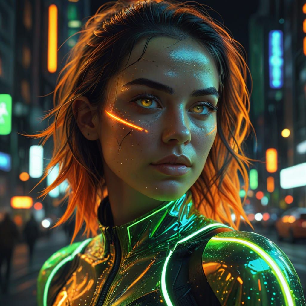 A striking picture of a young woman in neon green and orange clothing, set against a futuristic cityscape. The digital art features vibrant neon colors and cinematic lighting.