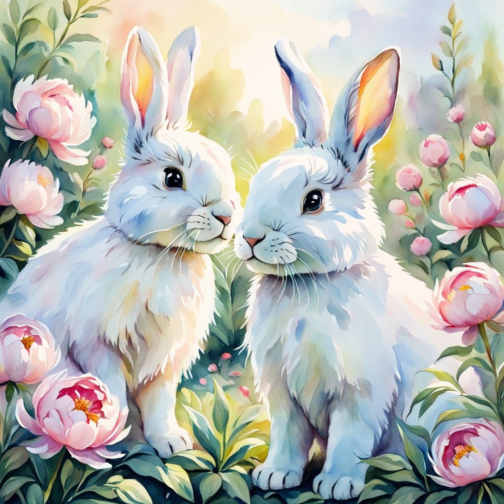 This image shows two adorable bunnies nestled among vibrant peonies in a lush garden. The artwork employs soft focus and pastel colors to create a dreamy, gentle watercolor painting.