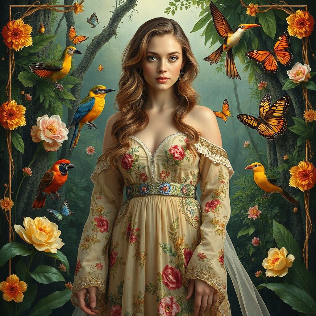 A striking picture of a woman as a guardian spirit in a vibrant rainforest. She is adorned with flowers and vines, surrounded by exotic birds and butterflies, in an ornate, symbolic art nouveau style.