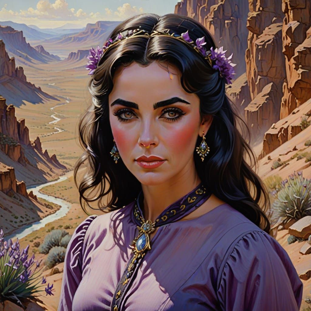 This image shows a close-up portrait of a beautiful, elven woman in a rocky desert. The portrait is rendered with impressionistic oil painting techniques.