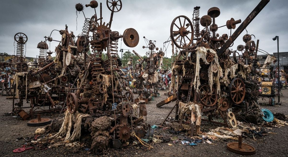 This image shows a large outdoor installation of rusted metal sculptures. The kinetic art features broken toys, gears, and other discarded materials in a surreal, apocalyptic playground aesthetic.