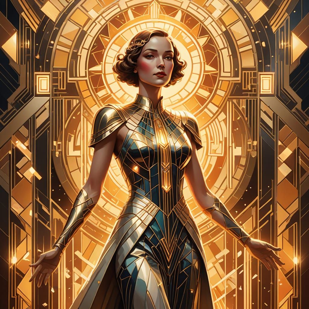 This Art Deco illustration features a female spirit of light with cubist influences. She wears flowing garments and has a radiant aura, set against ornate architecture during golden hour.