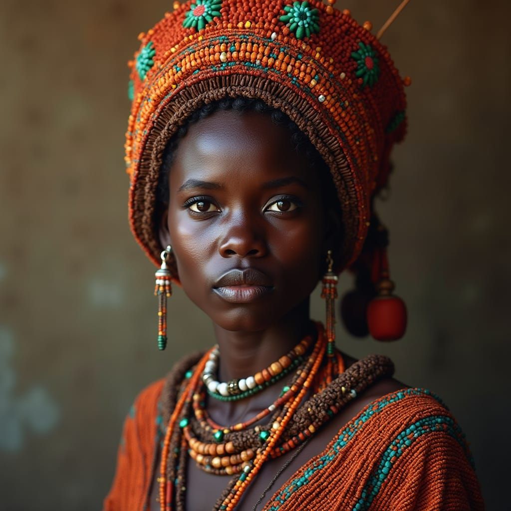 A hyperrealistic portrait of a Zulu woman in traditional beaded attire. The image showcases intricate textures and realistic lighting, rendered in a vibrant and colorful style.