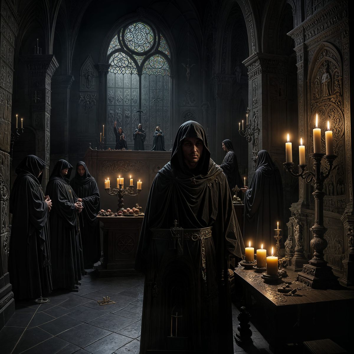 This image depicts a diabolical scene with Gregorian monks gathered around an altar. A nude woman is displayed on the altar in this disturbing and provocative scene.