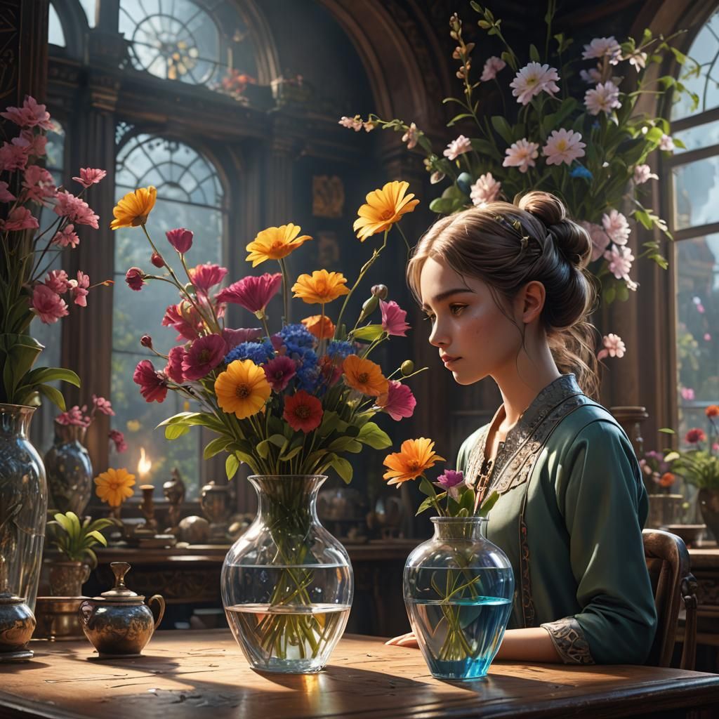This image shows a flower in a vase on a table with a girl nearby. The image has a detailed, matte painting style with deep color and intricate detail, reminiscent of fantasy concept art.