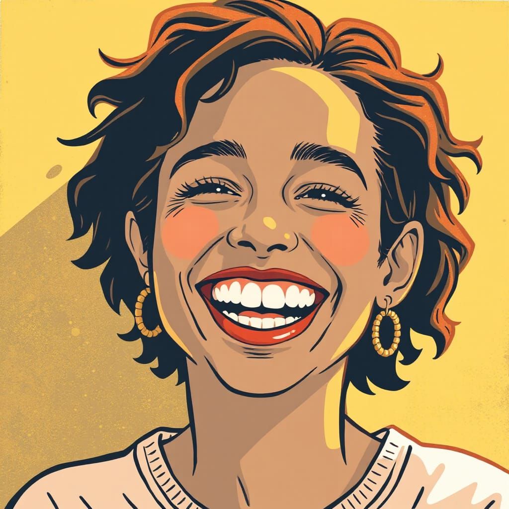 This image shows a person laughing with a bright, expressive face, illuminated by golden lighting. The art style features bold lines, vibrant colors, and whimsical textures.