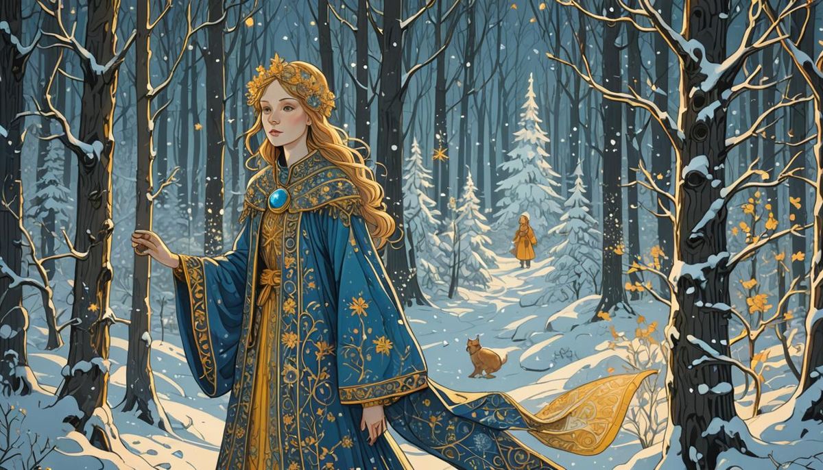 This image shows Snegurochka in a snow-covered forest. The picture captures a winter wonderland with frosty textures and intricate patterns. It is rendered as fantasy concept art in a high-contrast, mythological style.