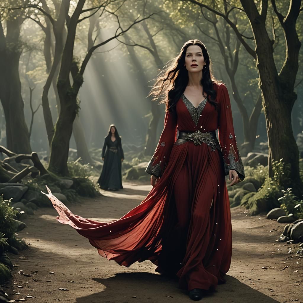 A cinematic film still of a woman with long dark hair wearing a red dress. Stars glow in her hair as she stands before an Elven city bathed in light. Best quality live action.