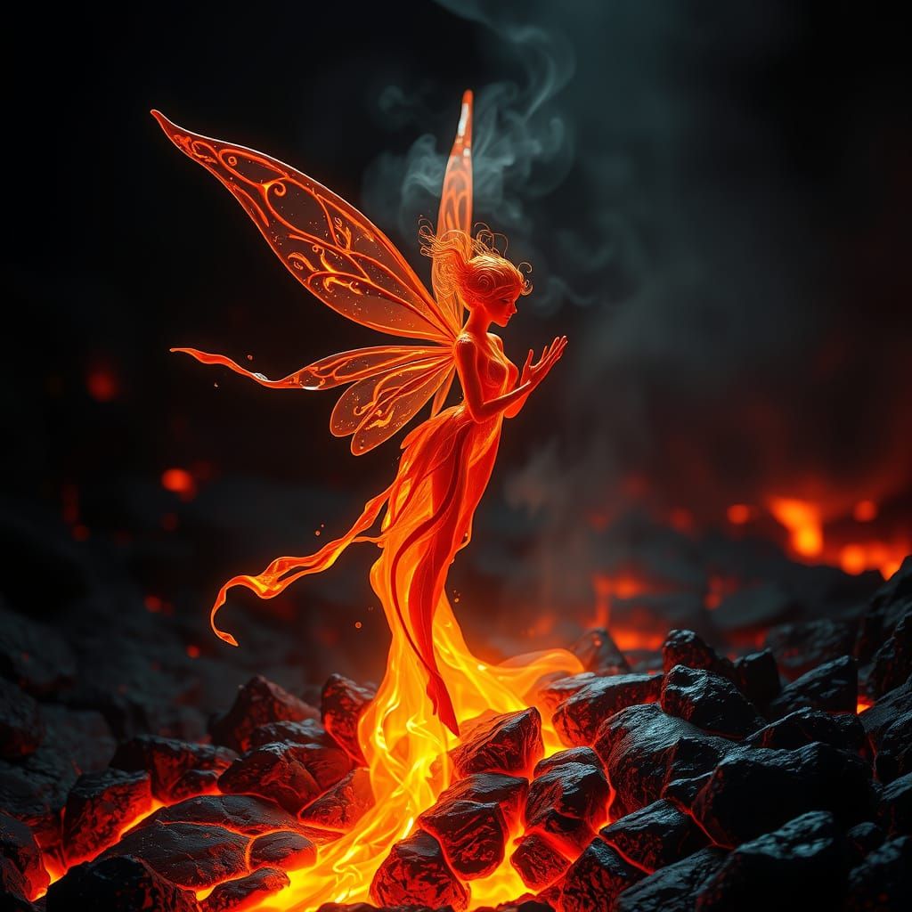 A delicate fairy sculpted from molten lava, emitting embers and smoke. Its internal heat illuminates a dark volcanic scene with vibrant, warm light. Rendered with dramatic, high-contrast lighting and a vivid, fiery palette.